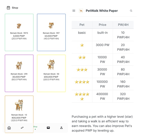 더 높은 레벨(별)의 펫을 구입하고 산책을 하는 것은 보상을 얻는 효율적인 방법