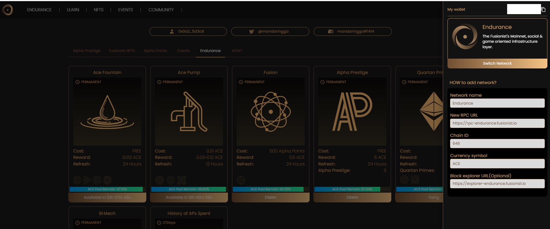 1번 Ace Fountain : Claim 클릭하면 0.012 ACE를 획득합니다. 24시간 한번씩