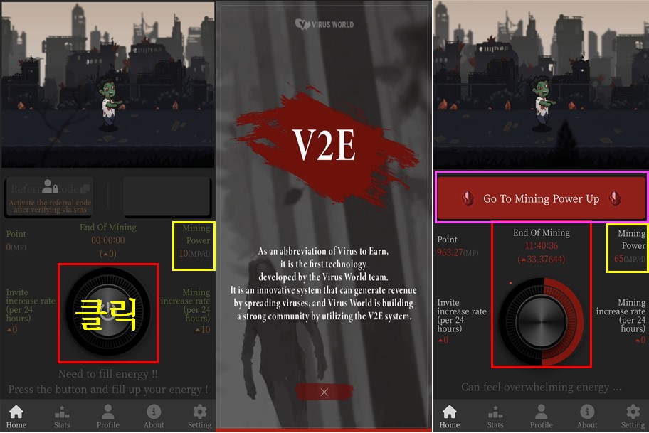 ⊙ 노란색박스 : Mining 파워로 분홍색 미션 수행시 올라감