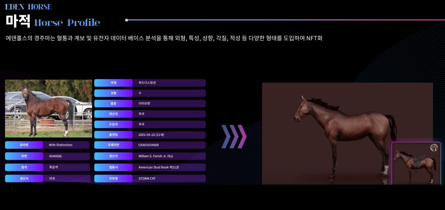 ◈ 실제 말을 모델링 해서 외형 및 특성, 성향, 각질, 적성 등 모든 요소를 적용하여 NFT 화