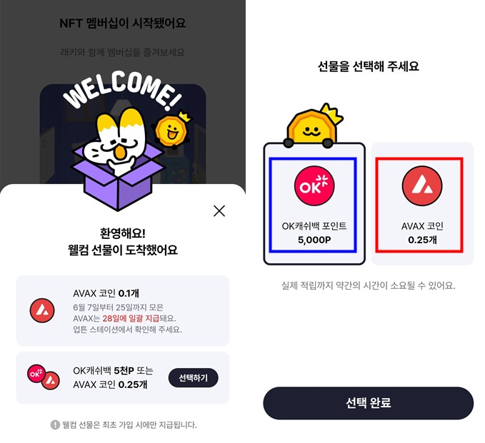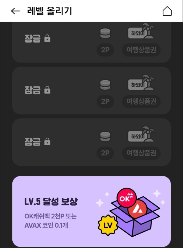 - 레벨업 마다 OKCashbog 포인트 또는 AVAX코인 추가지급