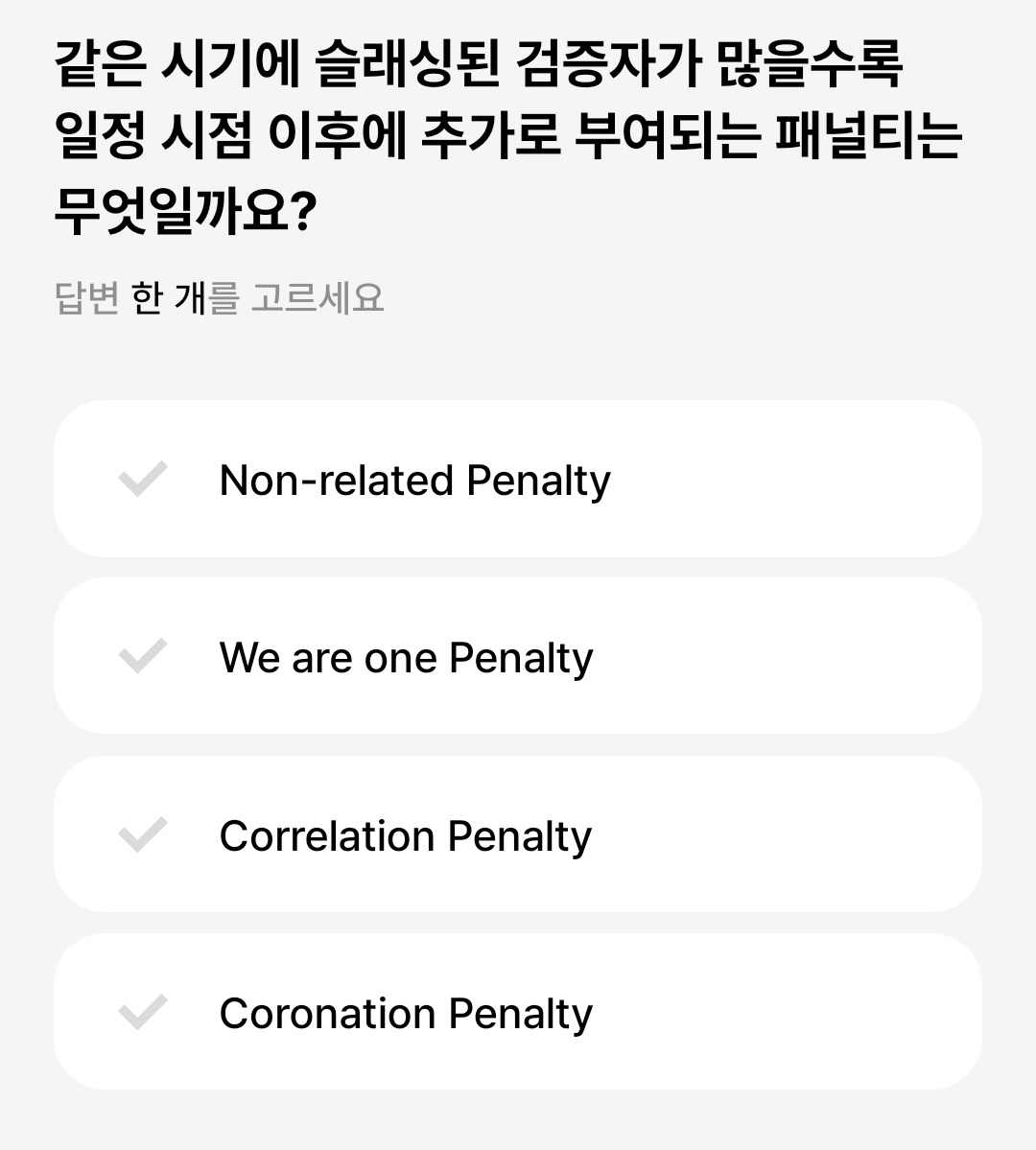 - 질문 : 같은 시기에 슬래싱된 검증자가 많을수록 일정 시점 이후에 추가로 부여되는 패널티는 무엇?