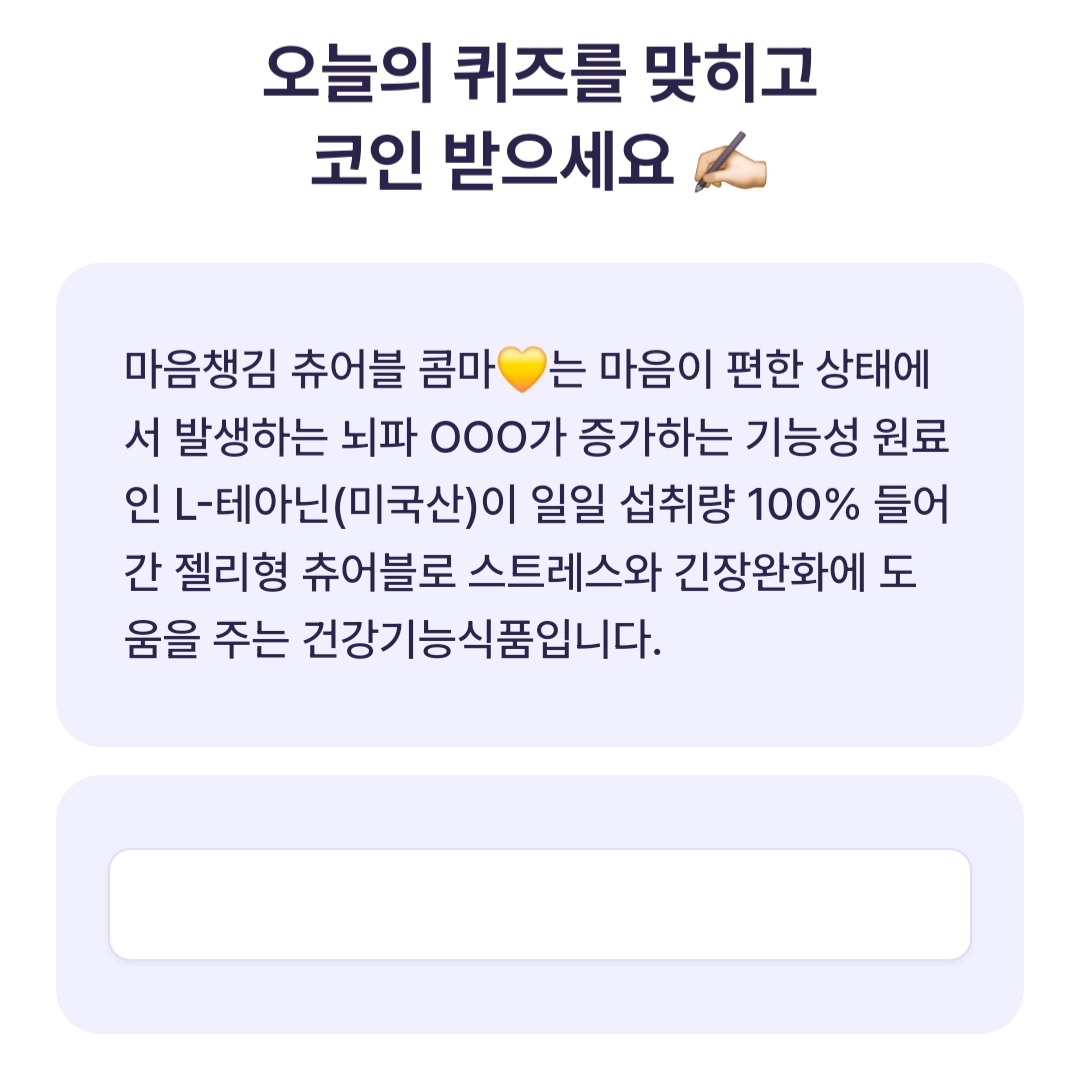 - 질문 : 마음챙김 츄어블 콤마는 마음이 편한 상태에서 발생하는 뇌파 OOO가 증가하는 기능성원료인