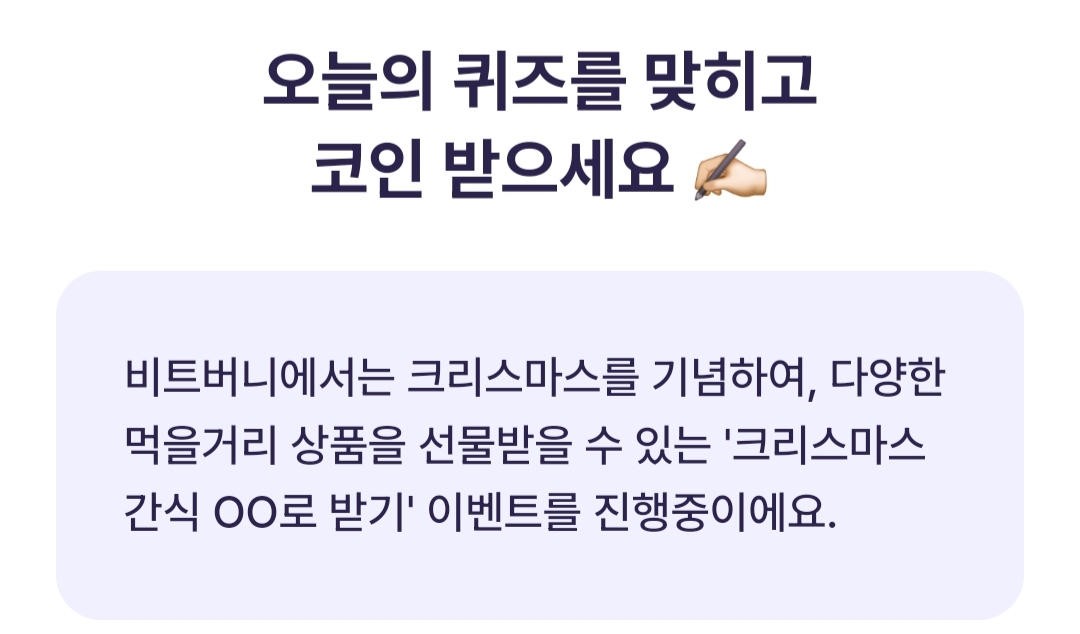 - 질문 : 비트버니에서는 크리스마스를 기념하여, 다양한 먹을거리 상품을 선물받을 수 있는 크리스마스 간식OO로 받기