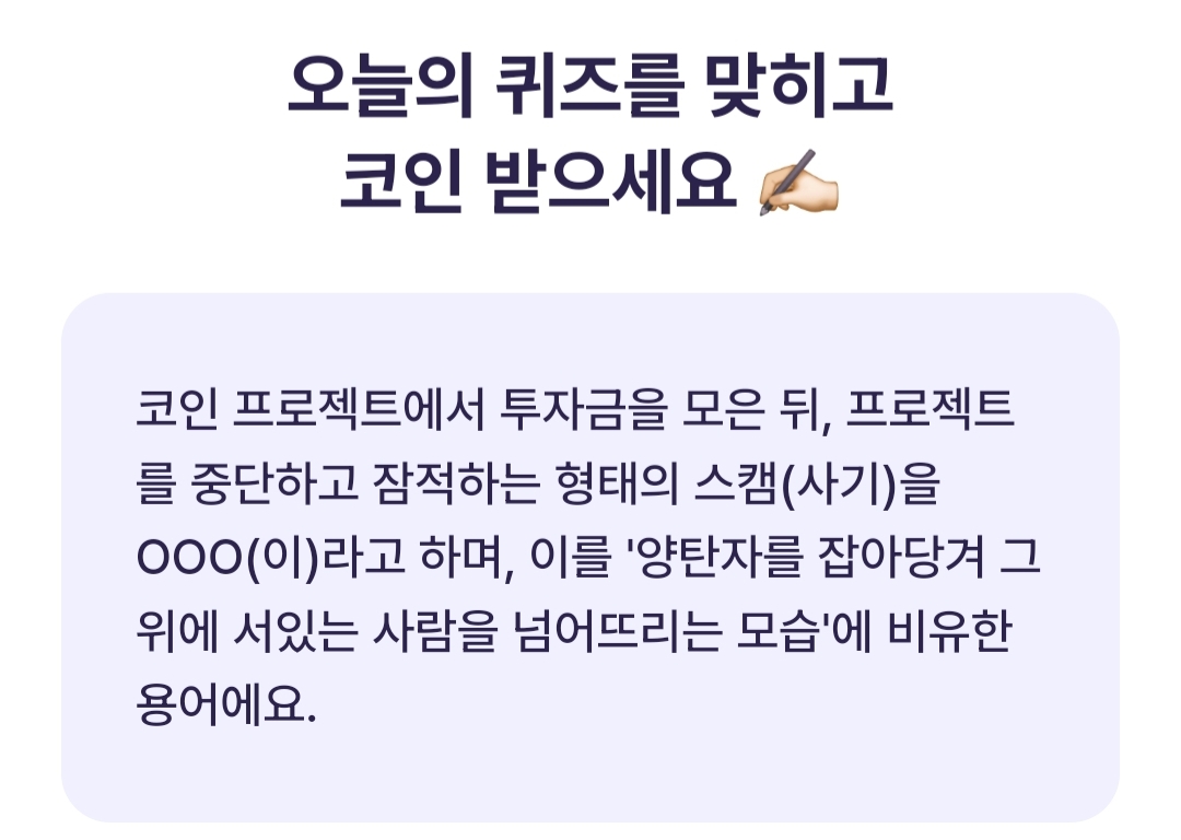 - 질문 : 코인프로젝트에서 투자금을 모은 뒤, 프로젝트 중단하고 잠적하는 스캠(사기)를 OOO