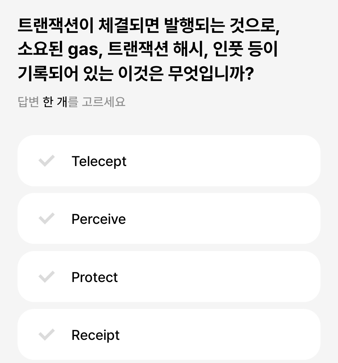 - 질문 : 트랜잭션이 체결되면 발행되는것으로 소요된 gas, 트랜잭션 해시, 인풋등이 기록되어있는 이것은?